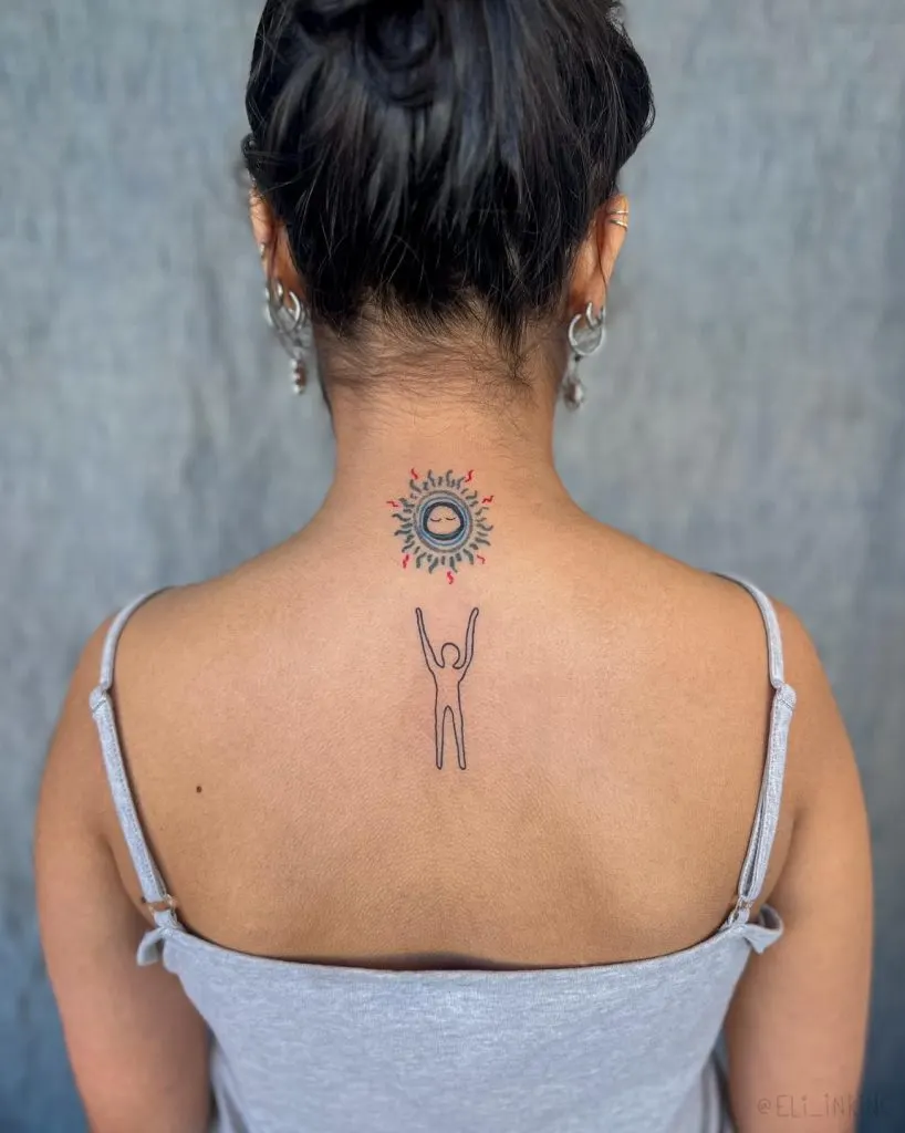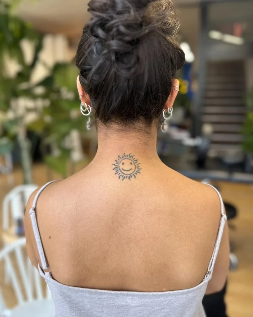 This was this tattoo’s third iteration, it started as a smiley face, became a sun from another artist and is now the piece that you see here. by eli_inking