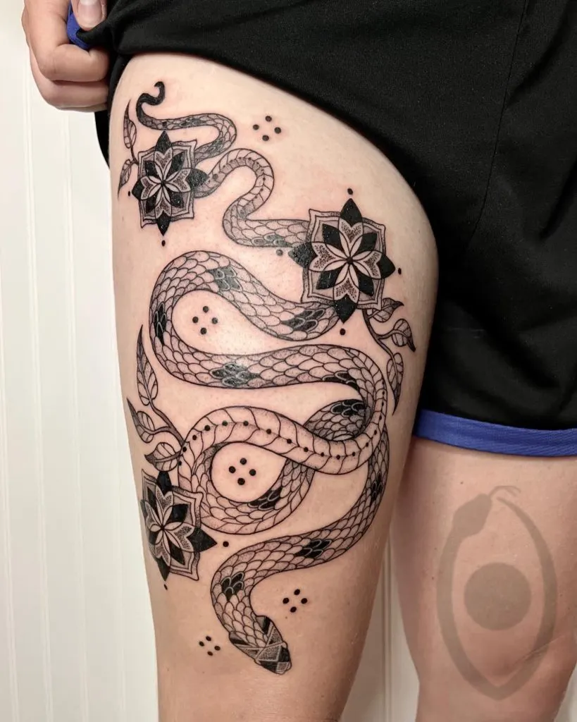 At number 4, this striking tattoo blends the dynamic motion of a serpent with a backdrop of blooming flowers and intricate geometric patterns. The flowing lines of the snake contrast with the delicate petals and leaves, creating a captivating interplay between nature and bold design. Perfect for those who appreciate symbolism and detail, this piece exudes mystery and elegance.